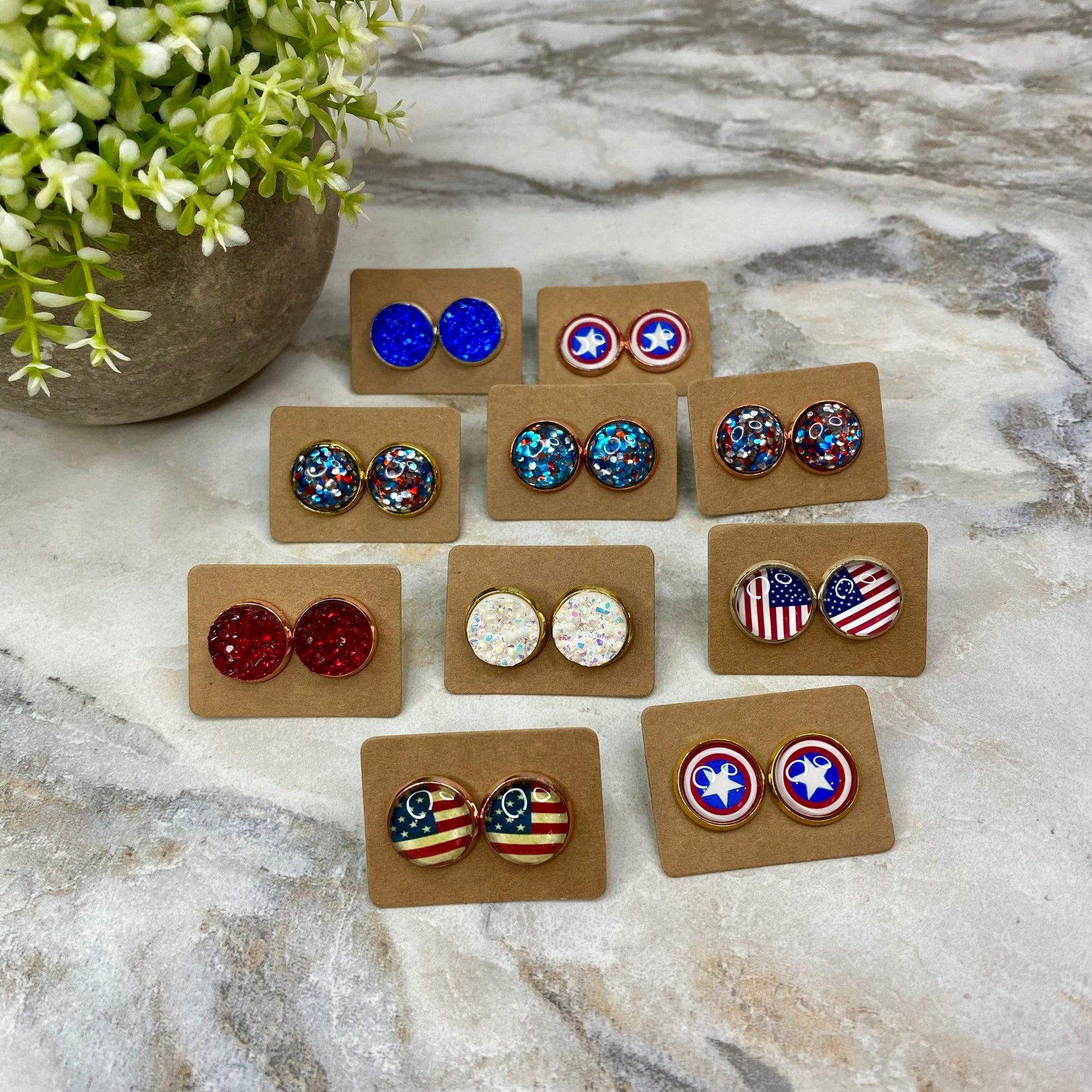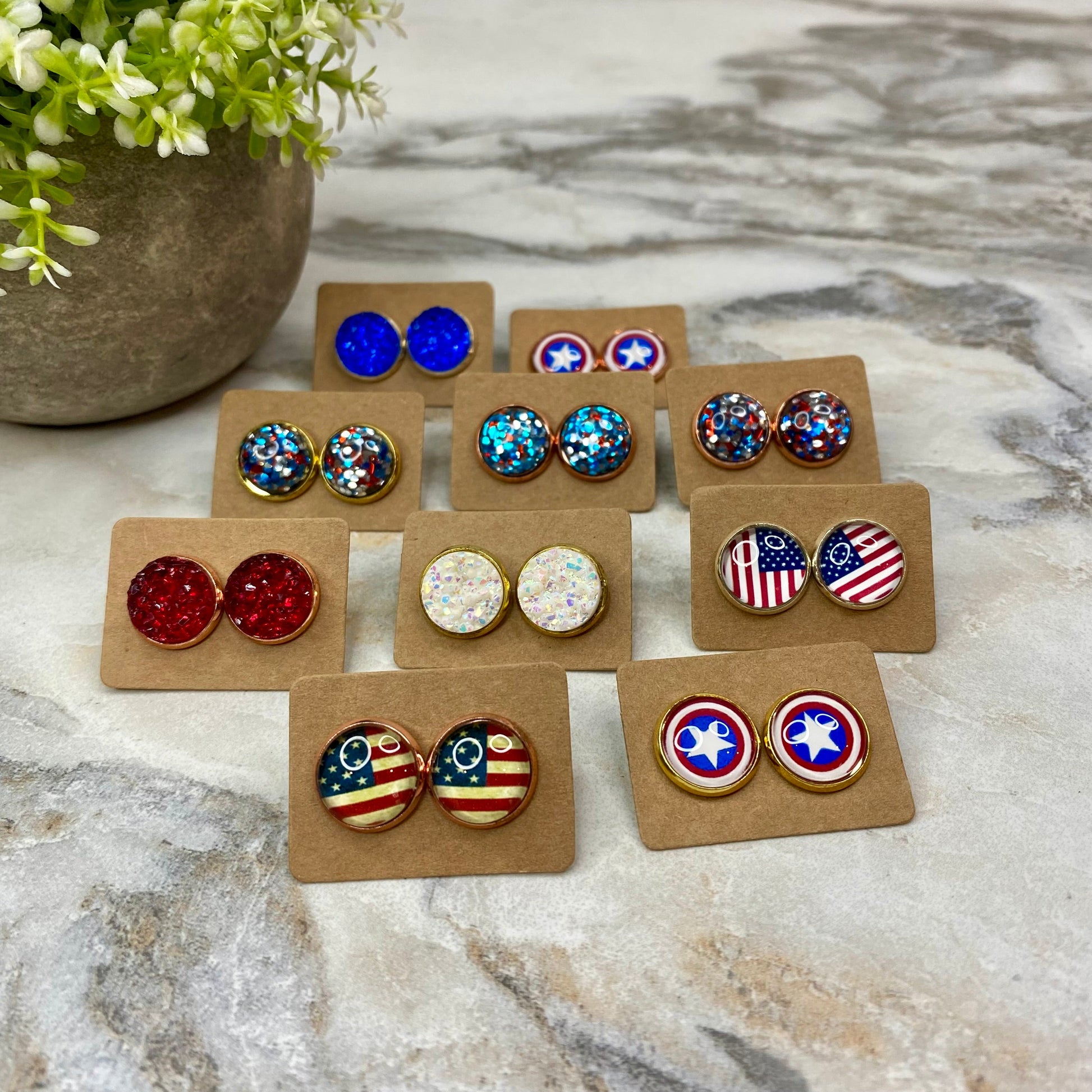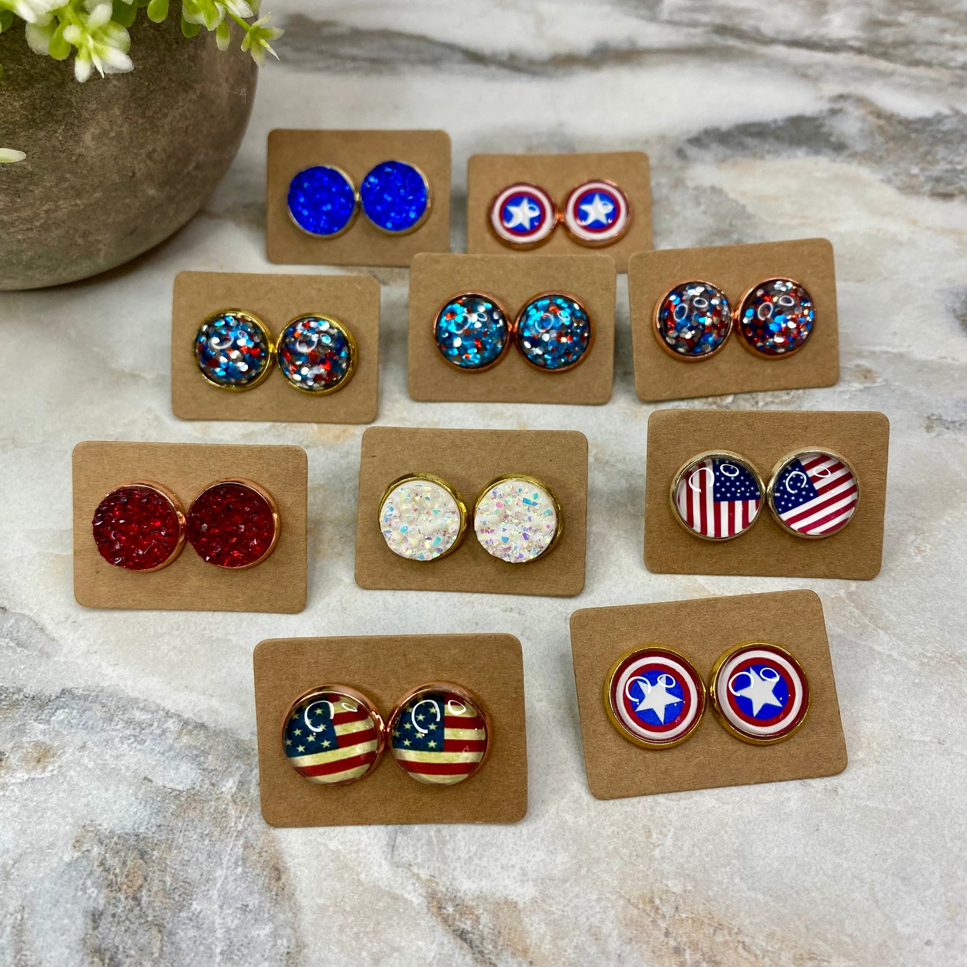 Acrylic/Druzy Stud Earrings - 12mm - Round Red, White, & Blue Mix