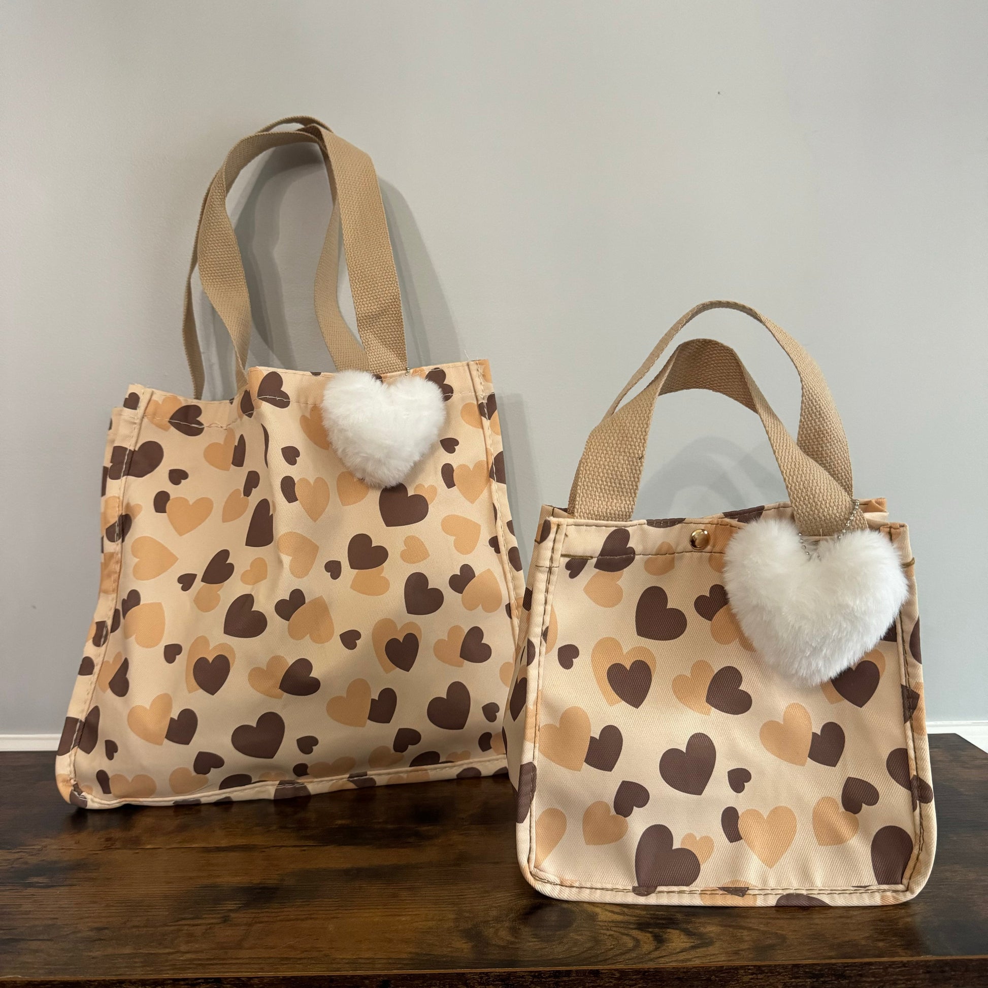 The cutest tote bags are ready for anything. Available in a small and large size, you can pick what suits your needs or do a “mommy and me” set! Comes with white Pom Pom heart keychain.