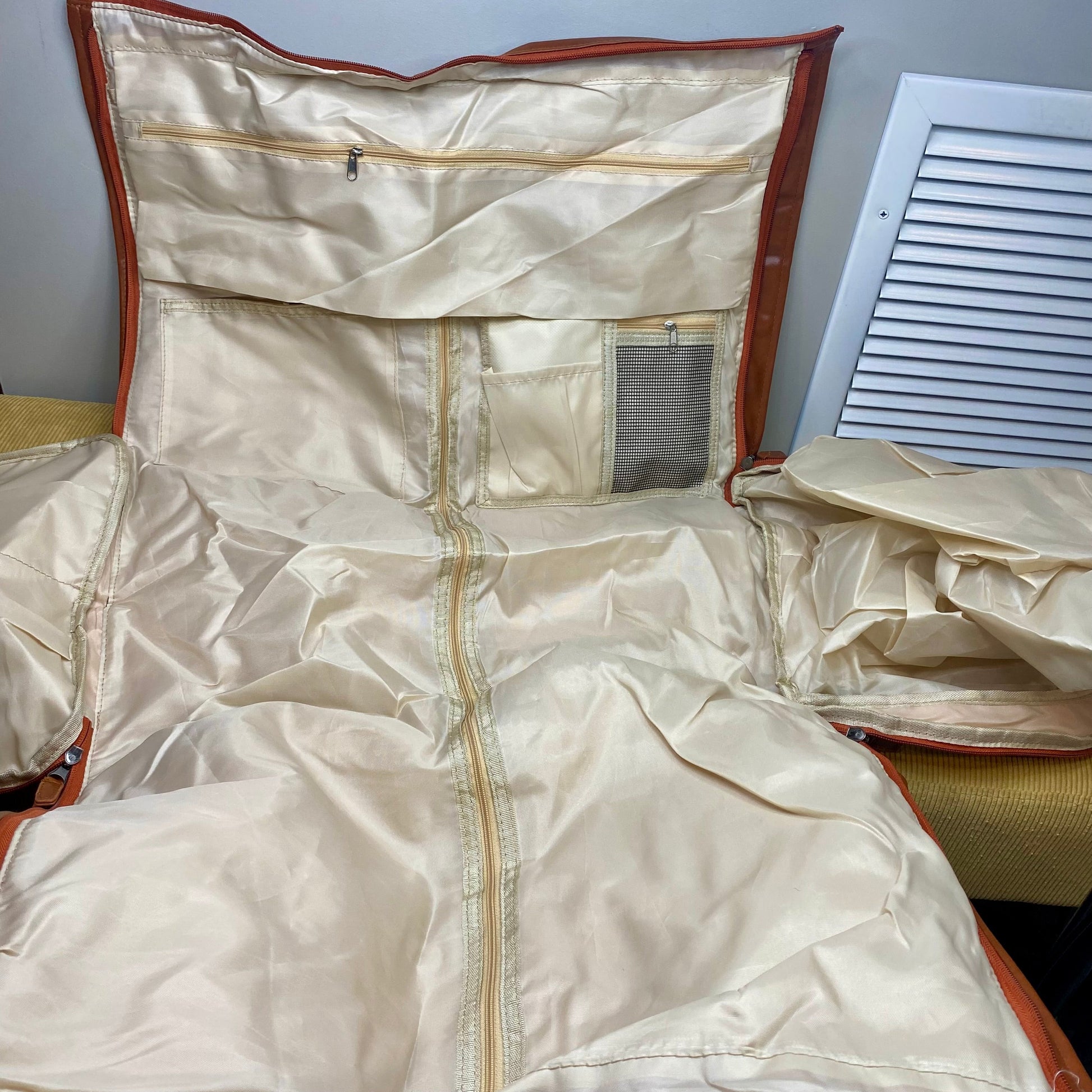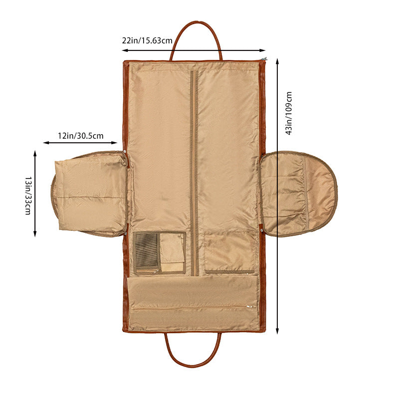 - Inside opens flat (if wanted) to a large open space to store all of your essentials. There are 2 zip pockets, one long zip pocket, 3 slip pockets, and a zippered long compartment to open up the very bottom of the bag to lay garments flat.