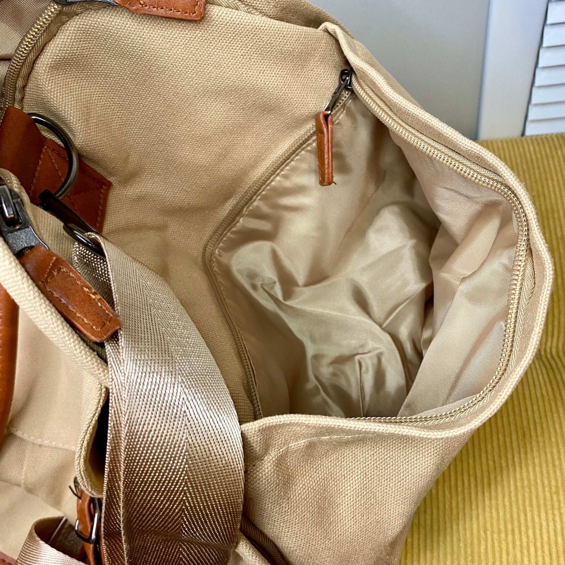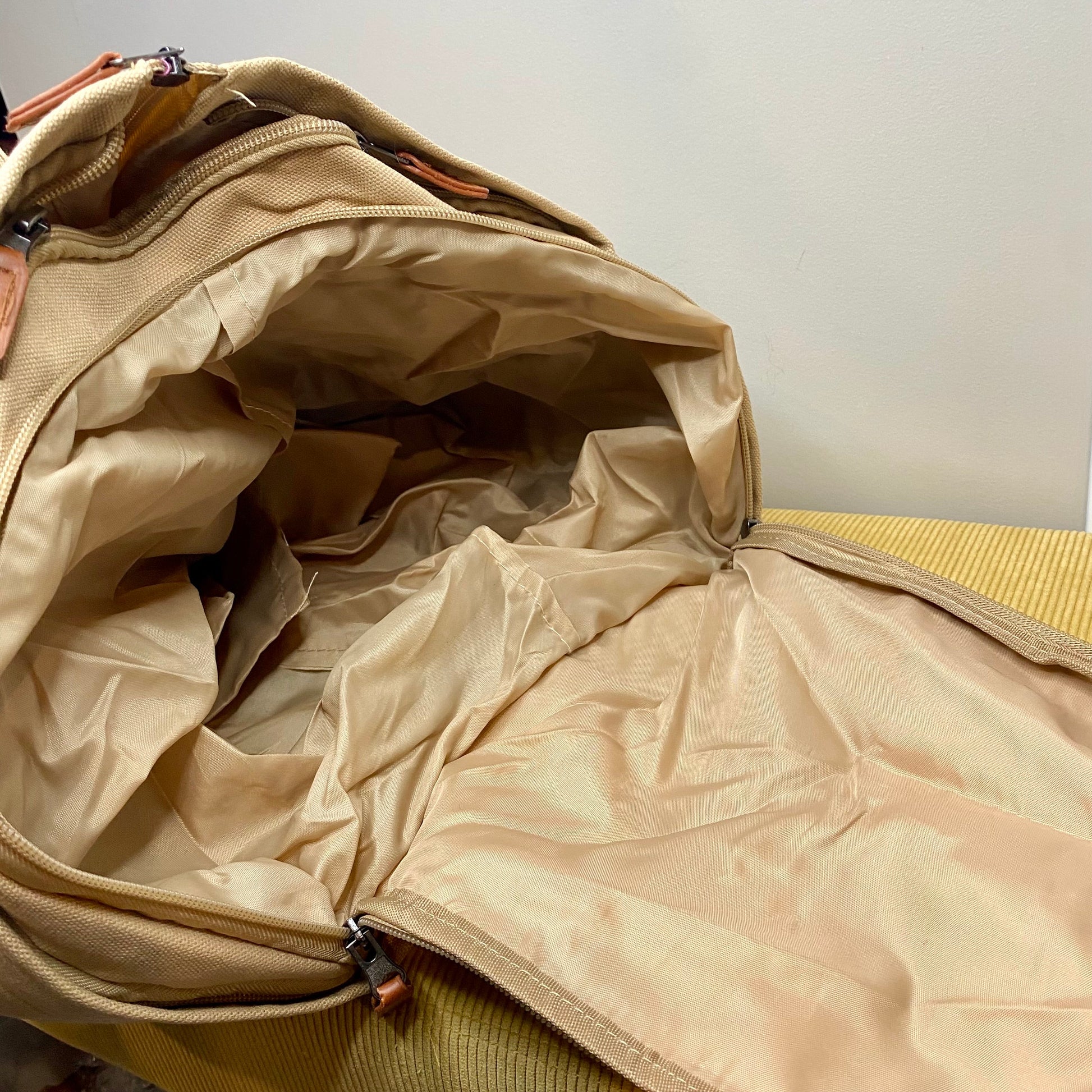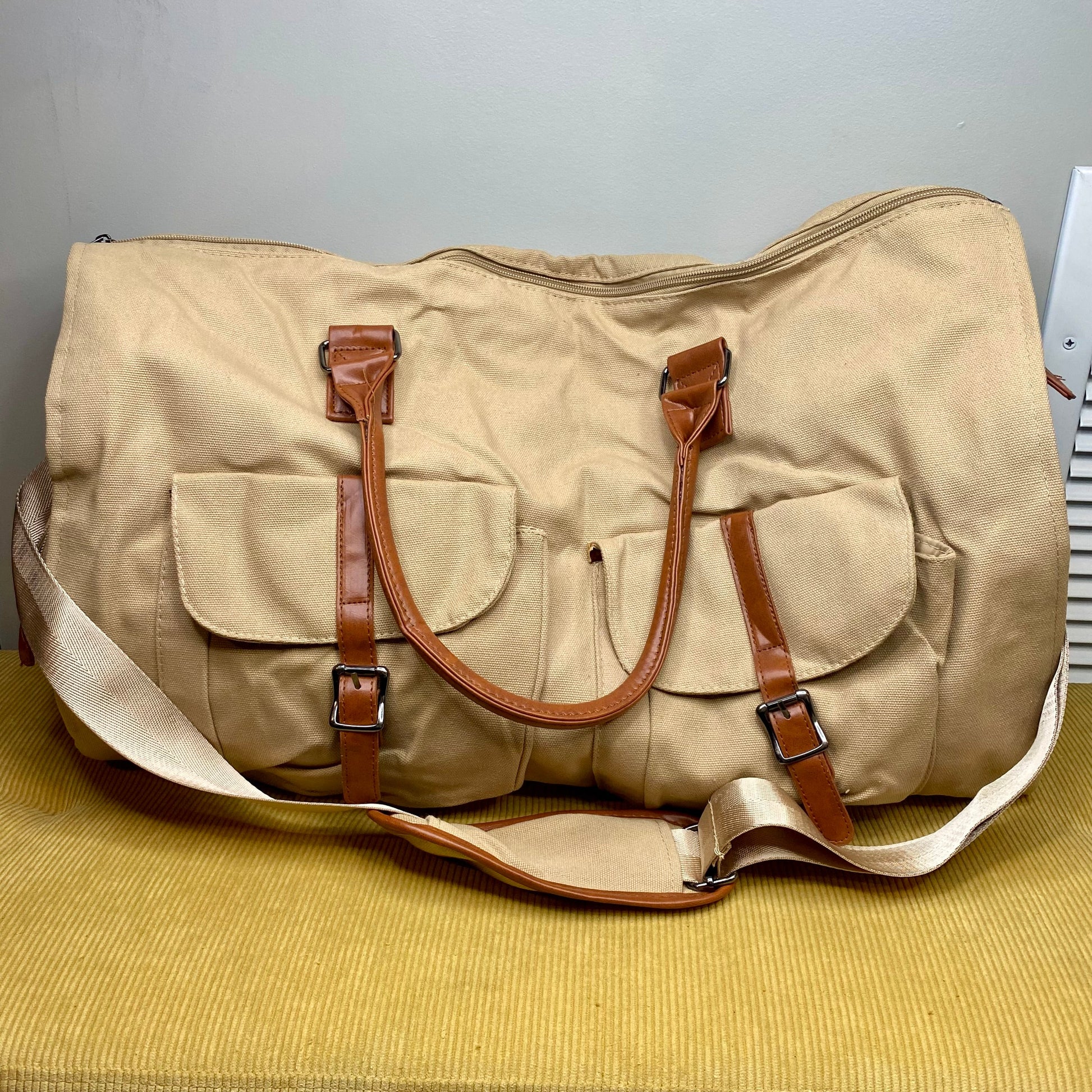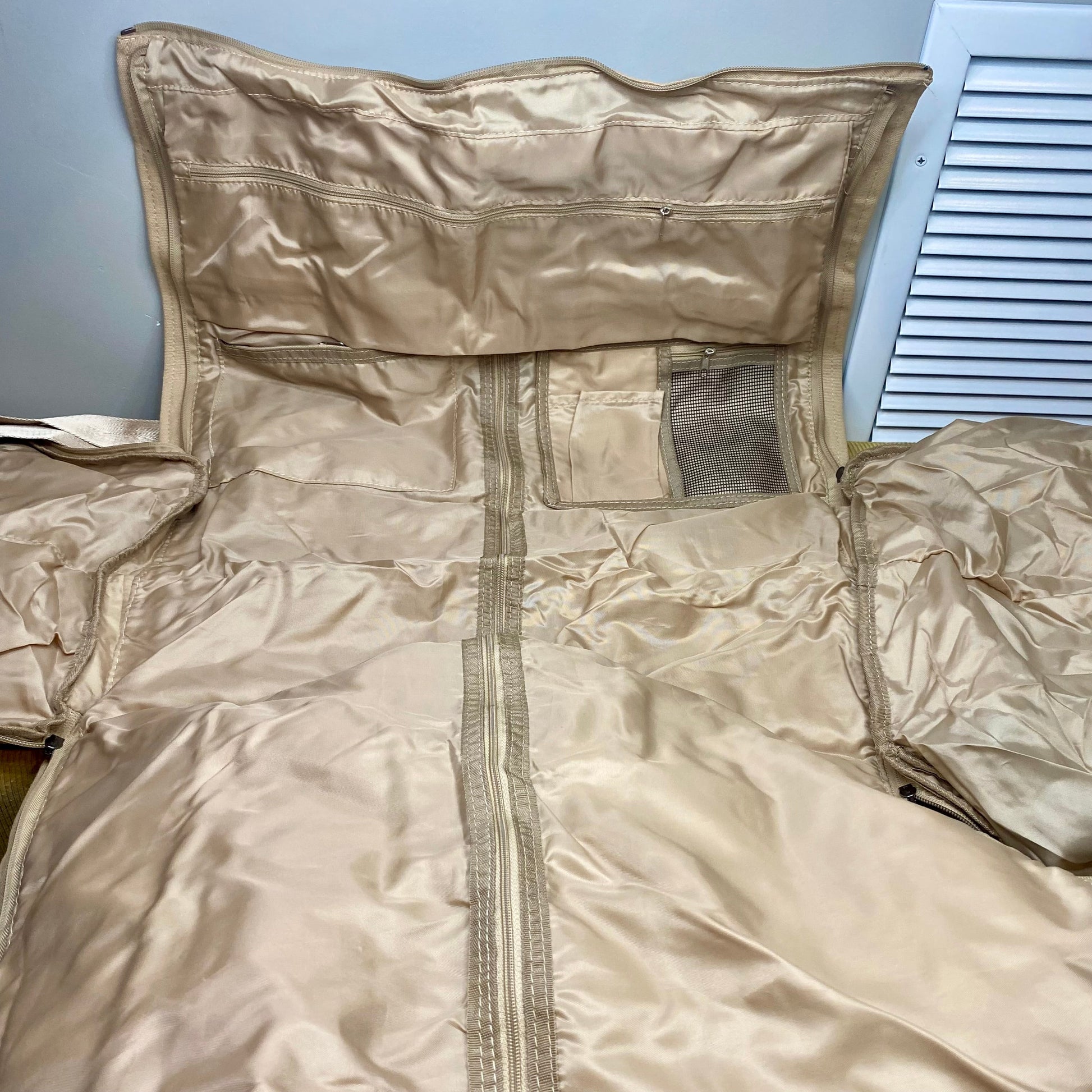 - Inside opens flat (if wanted) to a large open space to store all of your essentials. There are 2 zip pockets, one long zip pocket, 3 slip pockets, and a zippered long compartment to open up the very bottom of the bag to lay garments flat.
