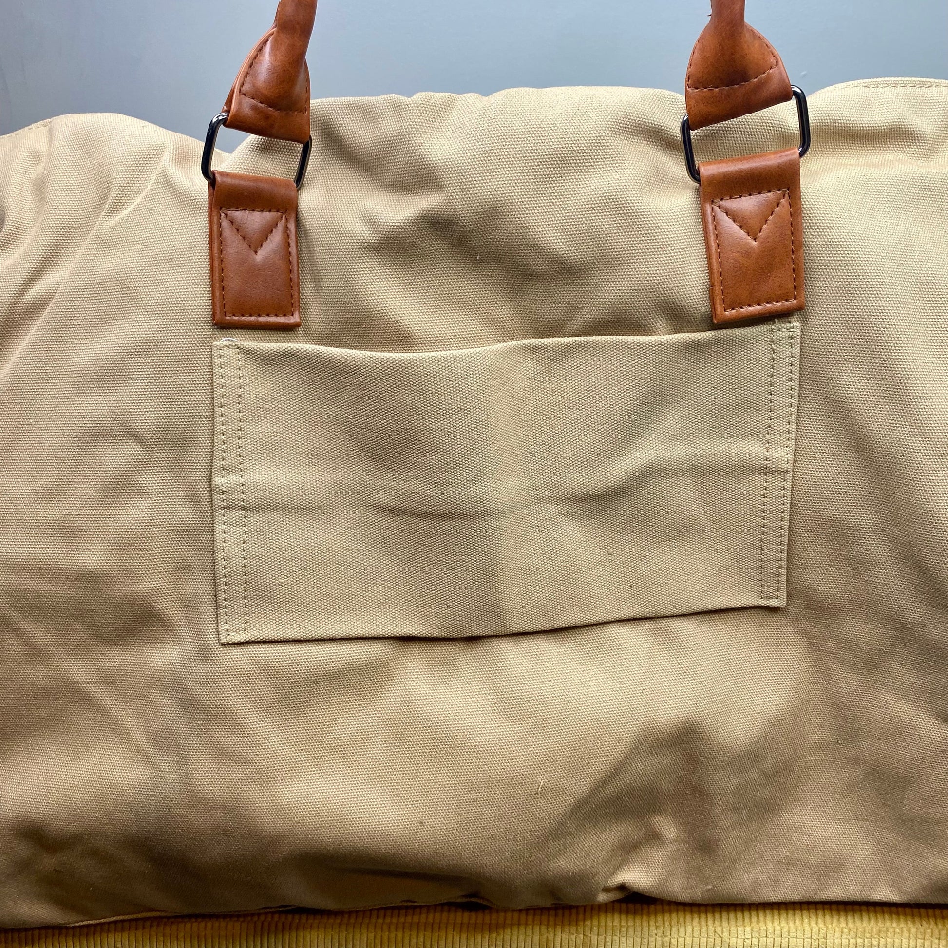 - The outside of this bag has 2 button pockets in the front, luggage slip pocket in the back, one large side opening to store things separate from the main compartment, and a zip pocket on the other side.