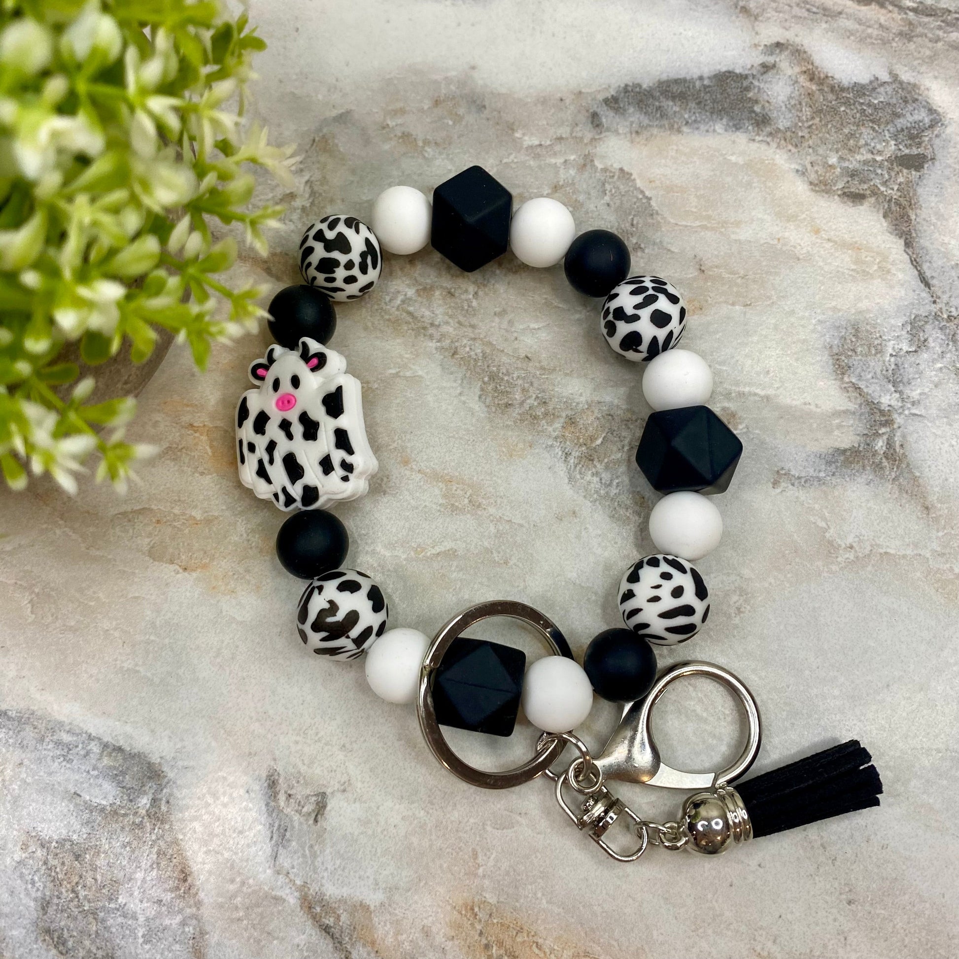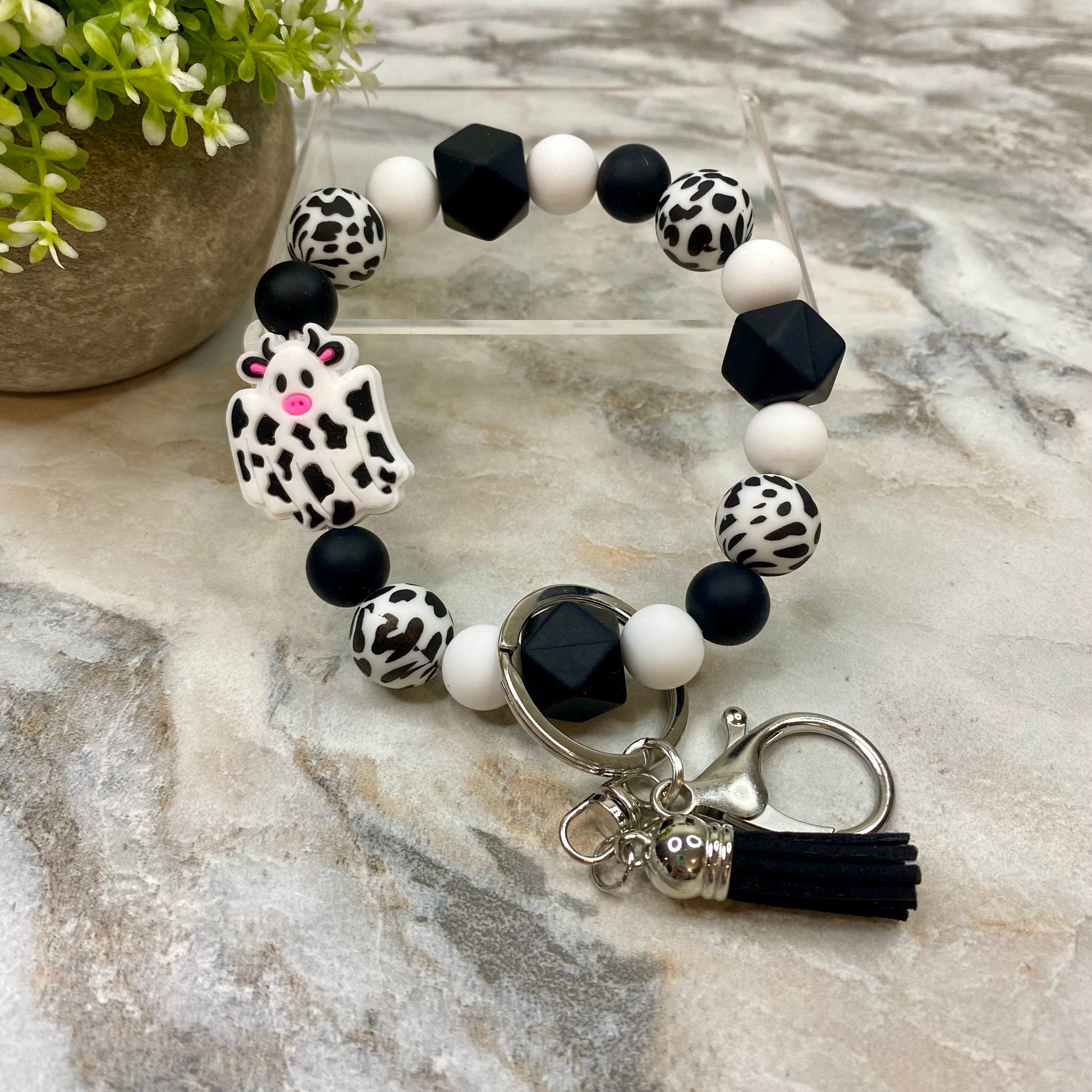 Silicone Bracelet Keychain with Tassel - Cow - Black