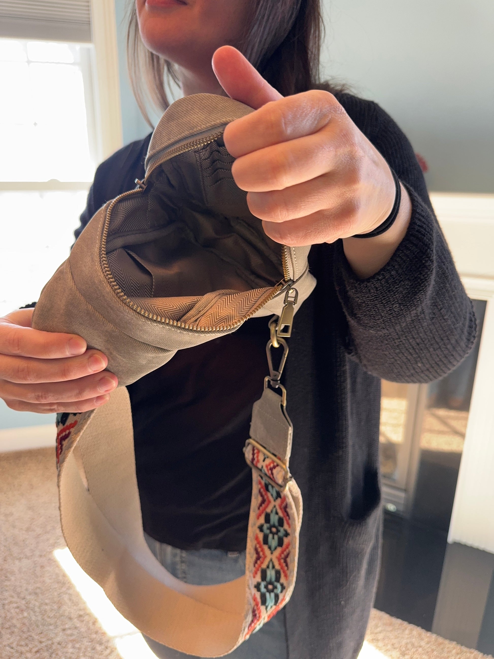 - Strap is adjustable, 31-55” & cannot be removed, but can be unclipped on the bottom to move the strap from the left side to the right side
